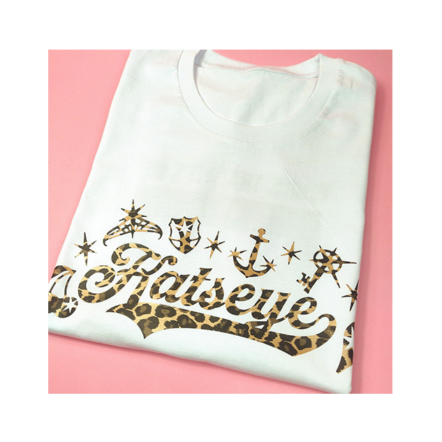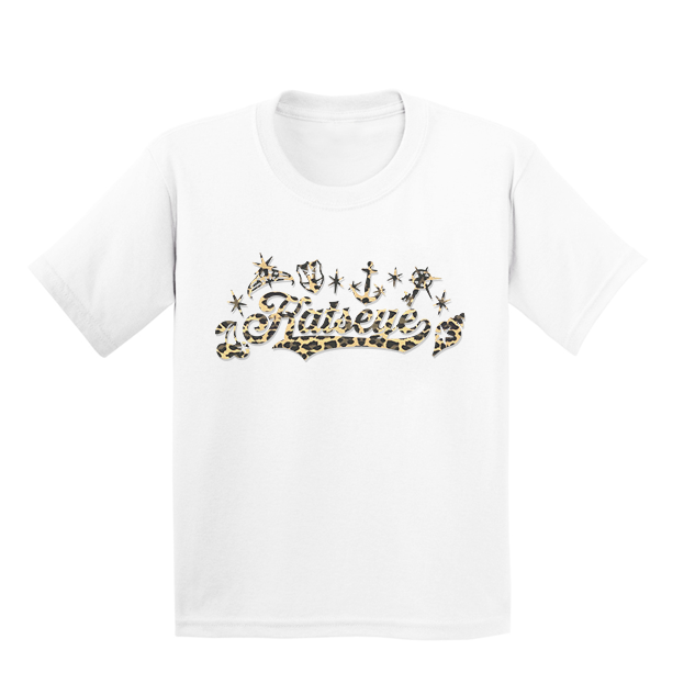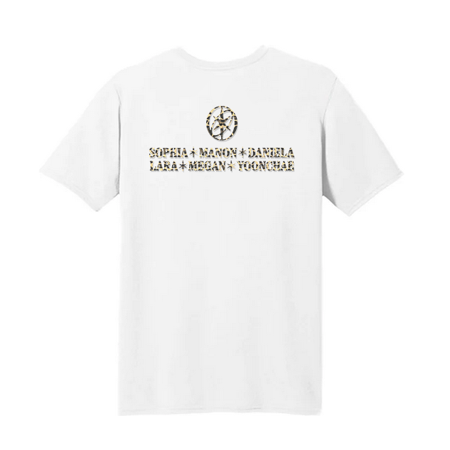 Biały t-shirt oversize o luźnym kroju z lekko obniżoną linią rękawów i panterkowym nadrukiem inspirowanym estetyką albumu SIS - Soft is Strong oraz logo i symboli reprezentujących członkinie zespołu KATSEYE.