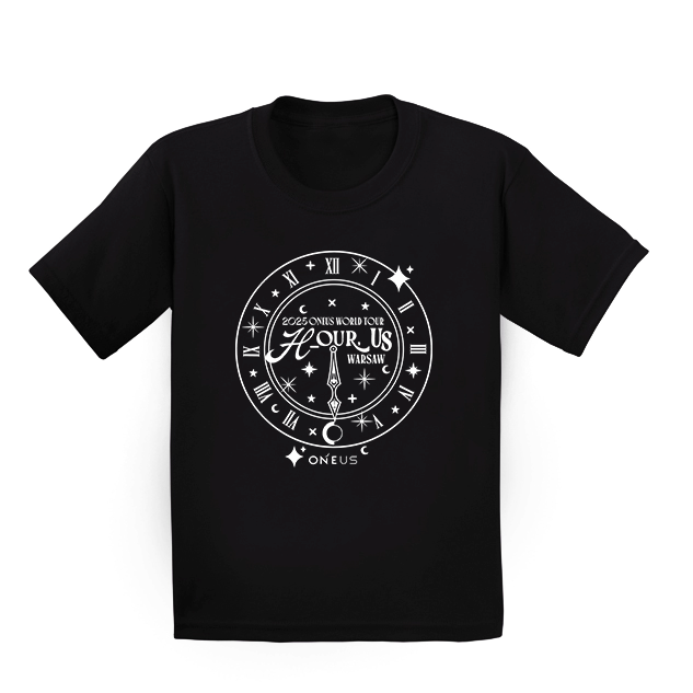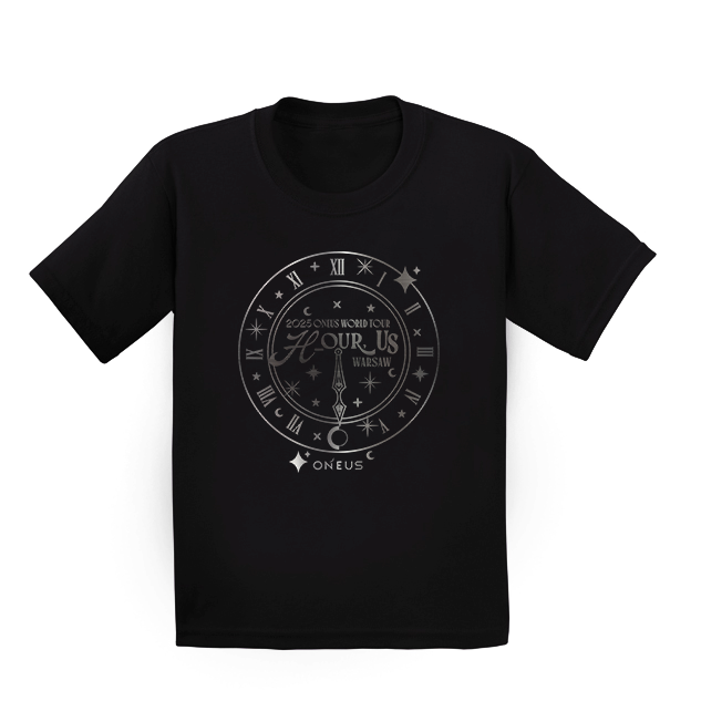Czarny t-shirt oversize o luźnym kroju z lekko obniżoną linią rękawów i jednostronnym nadrukiem inspirowanym motywami zegara oraz trasą koncertową 2025 ONEUS WORLD TOUR H_OUR, US