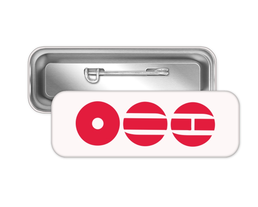 Przypinka w kształcie prostokąta z nadrukiem napisu EVERGLOW.
