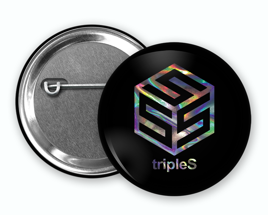 Przypinka w kształcie koła z prawdziwym połyskującym efektem holo i logo zespołu TripleS.